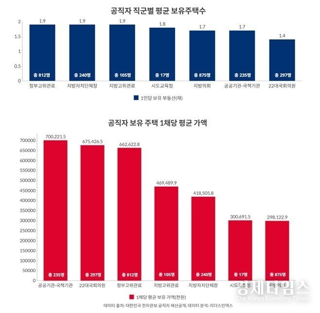 직군별 1인당 보유 주택 수를 보면 정부 고위관료가 1.89채로 가장 많았다. 이어 지자체장이 1.87채, 지방의회와 공공기관·국책 연구기관 공직자가 각 1.71채 수준이었다. 국회의원은 평균 1.41채를 보유했다.