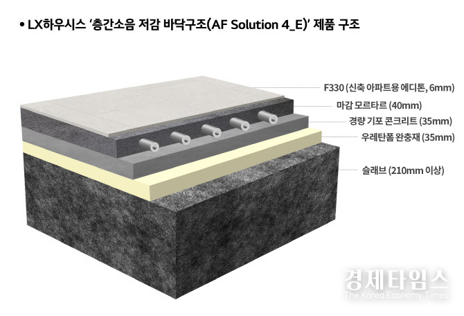 이번에 1등급을 획득한 LX하우시스의 바닥구조는 대부분 아파트 설계에 적용되는 경량 기포층을 포함한 범용 바닥구조(슬래브·완충재·경량기포·마감몰탈)에 LX하우시스 ‘신축 아파트용 에디톤’ 바닥재를 더했다. 에디톤 제품에는 자체 개발한 고강도 소재 ‘내추럴 스톤 코어’(천연석 분말과 고분자 수지를 고온·고압으로 압축)를 적용, 나무나 돌 등 다양한 디자인 구현이 가능하고 마루나 타일보다 충격에도 강하다.