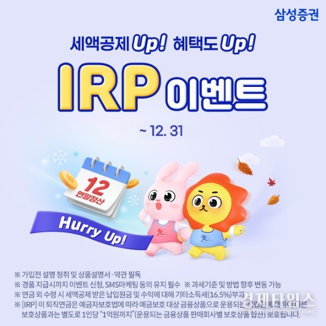 경제타임스 고은정 기자 | 삼성증권이 '세액공제 Up 혜택도 Up Hurry Up! IRP 이벤트'를 진행한다고 24일 밝혔다.