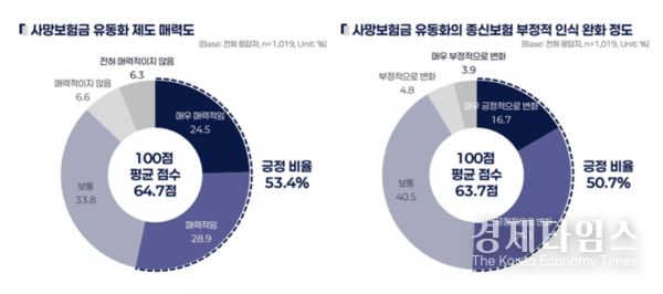 조사 결과, 제도 설명 후 매력도는 평균 64.7점, 긍정 응답은 53.4%로 나타났으며, 제도를 통한 종신보험의 부정적 인식 완화 정도도 평균 63.74점, 긍정 응답은 50.7%로 절반 이상이었다. 특히 이 제도가 도움이 될 상황으로는 ‘은퇴 후 노후 생활비’(37.0%), ‘중대질병 의료비’(24.4%), ‘간병비’(23.3%) 순으로 응답이 집중됐다.