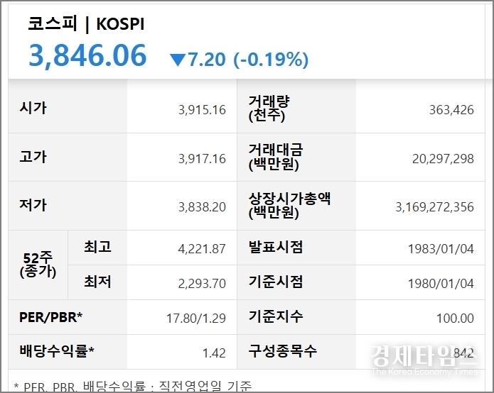 11월24일 코스피는 전 거래일 대비 7.20포인트(0.19%) 내린 3,846.06에 거래를 마쳤다. 지난 주말 존 윌리엄스 뉴욕 연방준비은행 총재가 금리 인하 가능성을 시사한 발언을 내놓으며 위험자산 선호가 강화됐으나, 이후 외국인이 전기전자 업종을 제외한 대부분 업종에서 차익실현 매물을 쏟아내며 지수의 상승 동력을 약화시켰다. 이날 유가증권시장에서 외국인과 개인은 각각 4,000억 원, 4,500억 원을 순매도했고, 기관은 9,000억 원을 순매수했다.