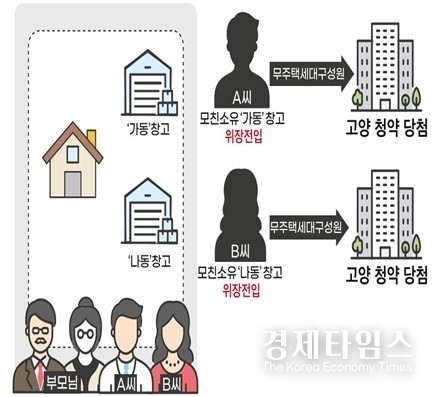 남매인 A씨와 B씨는 실제로는 부모와 함께 부모 소유 단독주택에 거주하면서도 무주택 세대 구성원 청약 자격을 얻고자 허위로 인근 창고 건물 2동에 각각 위장전입한 뒤 고양시에서 분양하는 주택에 추첨제로 청약해 각각 당첨됐다가 위장전입으로 적발됐다.