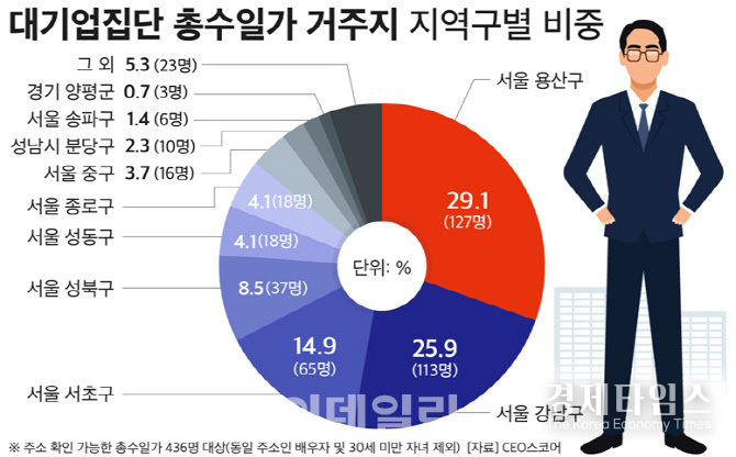 서울 내에서도 용산(29.1%, 127명)·강남(25.9%, 113명)·서초(14.9%, 65명) 3개 구에 거주하는 총수들은 전체의 69.9%인 305명. 3개 구의 집값은 전국에서 가장 높은 수준이다. 동 단위로 살펴보면 용산구 이태원·한남동에 가장 많은 총수 일가가 거주하는 것으로 파악됐다. 이들 지역에는 삼성, SK, 현대차, LG 등 32개 그룹의 총수 일가 100명(22.9%)이 주소를 두고 있었다.