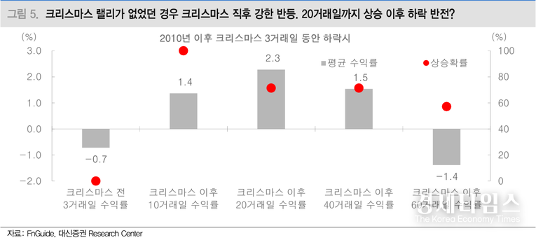 이에 대신증권은 “크리스마스를 앞두고 지수가 강하게 반등할 경우에는 추격 매수보다 단기 트레이딩에 집중하고, 주도주 비중확대는 시점을 늦출 필요가 있다”며 “반대로 연말을 앞두고 조정이 나타난다면 중기 관점에서 비중확대 기회로 활용할 수 있다”고 설명했다.