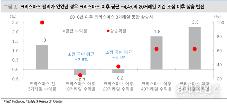 경제타임스 온인주 기자 | 연말·연초 증시 강세를 의미하는 ‘크리스마스 랠리’에 대한 기대가 커지고 있지만, 단순한 랠리 추종보다는 변동성을 활용한 전략적 비중확대가 유효하다는 분석이 나왔다. 크리스마스 전후 증시 흐름을 단기 이벤트로 보기보다, 이후 중기 수익률 경로까지 함께 점검할 필요가 있다는 진단이다.