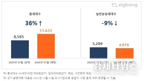 1월5일 부동산 정보 플랫폼 직방에 따르면 올해 1월 전국 아파트 총분양 예정 물량은 1만1,635가구로, 지난해 1월(8,585가구) 대비 36% 증가했다. 반면 일반분양(청약) 예정 물량은 4,816가구로, 작년 1월(5,289가구)보다 9% 감소하는 것으로 집계됐다.