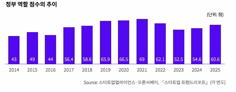 정부 역할에 대한 평가는 2014년 40점대 초반에서 출발해 2021년 69점까지 상승하며 장기적으로 개선되는 추세를 보였다. 다만 투자 혹한기가 시작된 2022~2023년에는 일시적인 하락이 나타났으며, 이후 다시 회복세로 전환됐다. 조사 기간 전반에 걸쳐 정부가 시급히 개선해야 할 과제로는 ‘자금·투자 활성화’와 ‘규제 완화’가 반복적으로 상위에 올랐다. 경기 국면에 따라 ‘M&A·IPO 활성화’나 ‘우수 인재 확보’ 등의 과제가 부각되는 경향도 확인됐다.
