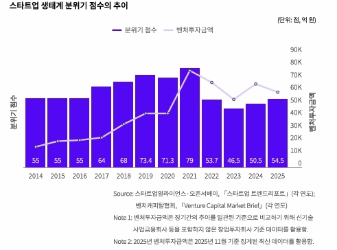 리포트에 따르면 스타트업 생태계 전반에 대한 분위기 점수는 정체 상태를 보이다가 2017년 이후 상승 국면에 진입해 2021년 정점을 기록했다. 이후 2022년 투자 환경 악화와 함께 급락했으나, 2024년부터는 완만한 회복 국면에 접어든 것으로 나타났다. 이러한 흐름은 벤처투자 환경 변화와 유사한 패턴을 보이며, 생태계 인식이 자금 조달 여건과 밀접하게 연동돼 있음을 보여준다는 분석이다.