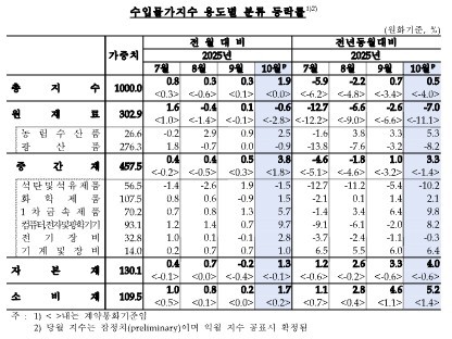 품목별로는 중간재의 상승 폭이 컸다. 1차금속제품 등이 오르며 중간재가 1.0% 상승했고, 자본재와 소비재도 각각 0.7%, 0.4% 올랐다. 원재료 역시 광산품을 중심으로 전월 대비 0.1% 상승했다. 세부적으로는 1차금속제품(3.8%), 기계및장비(0.8%), 화학제품(0.7%), 컴퓨터·전자및광학기기(0.7%) 등이 오름세를 주도했다.