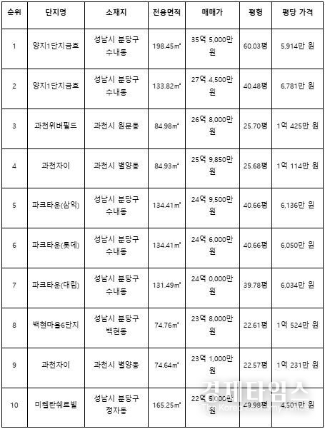 최고가 거래 상위 10건 역시 성남시 분당구와 과천시에서 발생했다. 분당구에서는 수내동과 정자동, 과천시에서는 별양동과 원문동 소재 단지가 상위권에 포함됐다. 최고가(35억 5,000만원) 1위를 기록한 양지1단지금호 전용 198.45㎡(60.03평)의 평당 평균 가격은 5,914만원으로 집계됐다. 같은 단지의 전용 133.82㎡(40.48평)도 27억4500만원에 거래되며 2위에 올랐다.