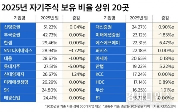 개별 기업 중 자사주 보유 비중이 가장 높은 곳은 신영증권(51.23%)으로 나타났으며, 부국증권(42.73%), 한샘(29.46%) 등이 뒤를 이었다. 이들 기업은 이미 높은 자사주 비중을 확보하고 있는 만큼, 향후 소각 결정 여부에 따라 주가 변동성이 크게 확대될 전망이다.