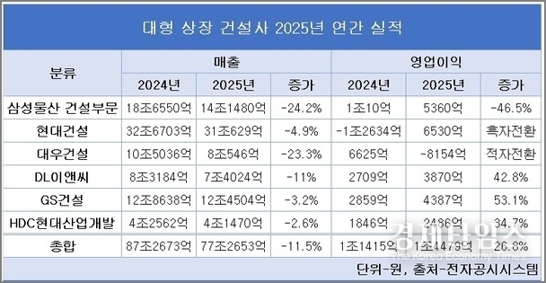 경제타임스 김은국 기자 | 한국 건설업계를 상징하는 상장 대형 건설사들이 지난해 나란히 ‘외형 축소’라는 성적표를 받아들었다. 고금리와 공사비 급등, 국내 주택 경기 둔화라는 삼중고 속에서 매출 규모는 줄었지만, 수익성 위주의 선별 수주 전략이 가동되며 영업이익에서는 극명한 온도 차를 보였다.