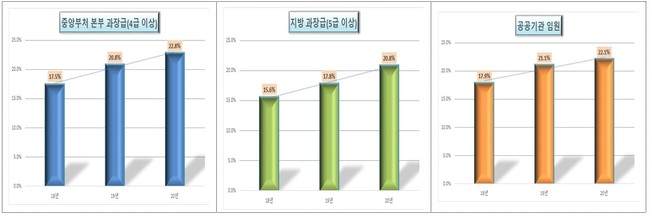 2019년에 이어 2020년에도 총 12개 분야 모두 목표를 달성했고 특히 지방공기업 관리자는 2022년 목표 10%까지, 지방과장급 등 3개 분야는 2021년 목표까지 조기에 달성했다.